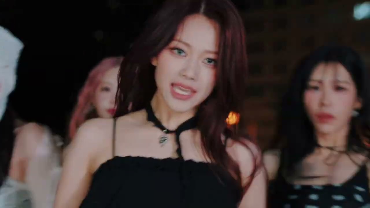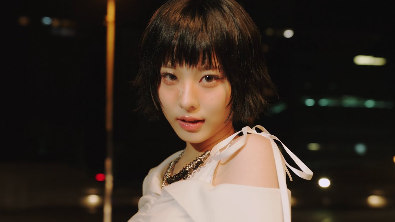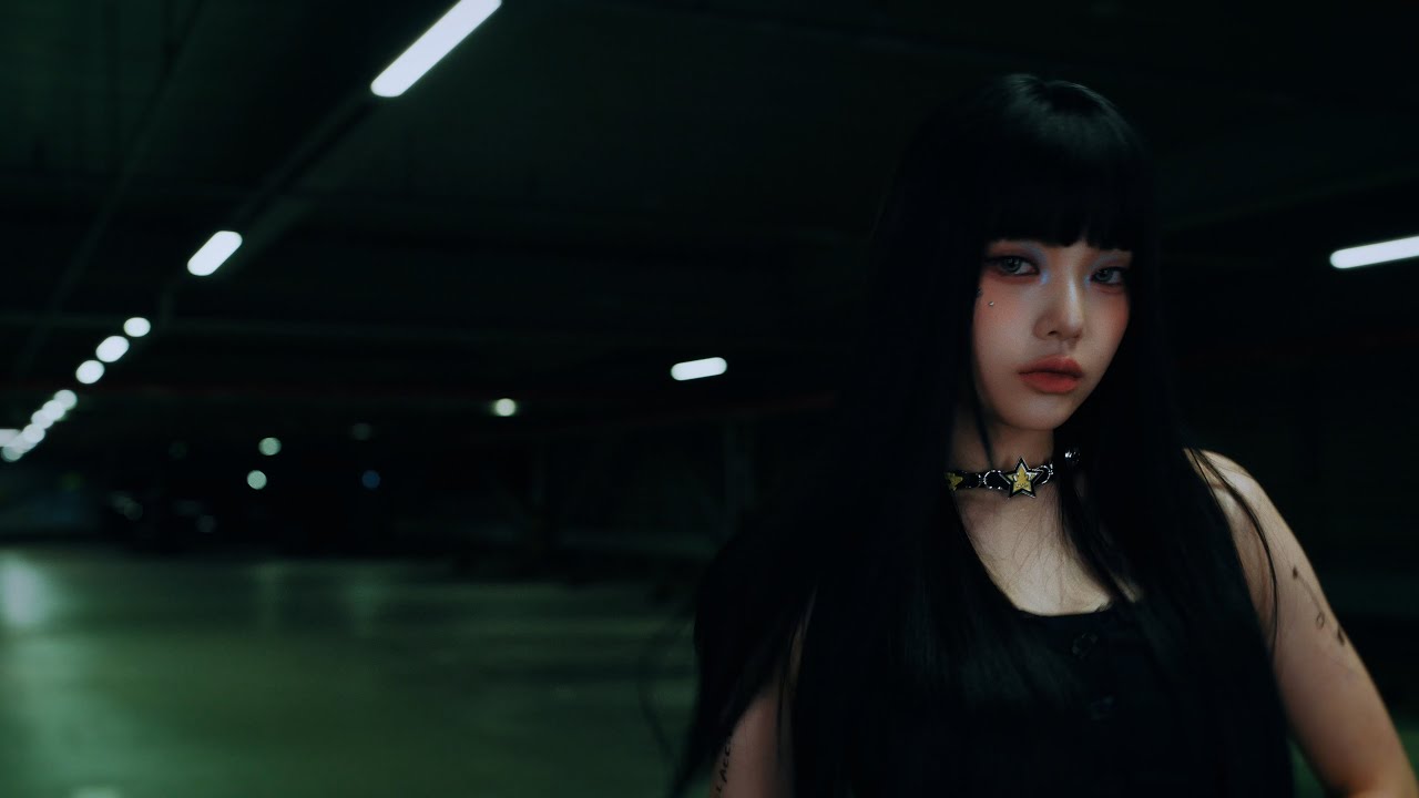 Boeun aparece com seu visual poderoso de diva, vestida de top e mini saia preta, e exibe um olhar e sorriso travesso para a câmera enquanto caminha à noite por um estacionamento na cidade.
