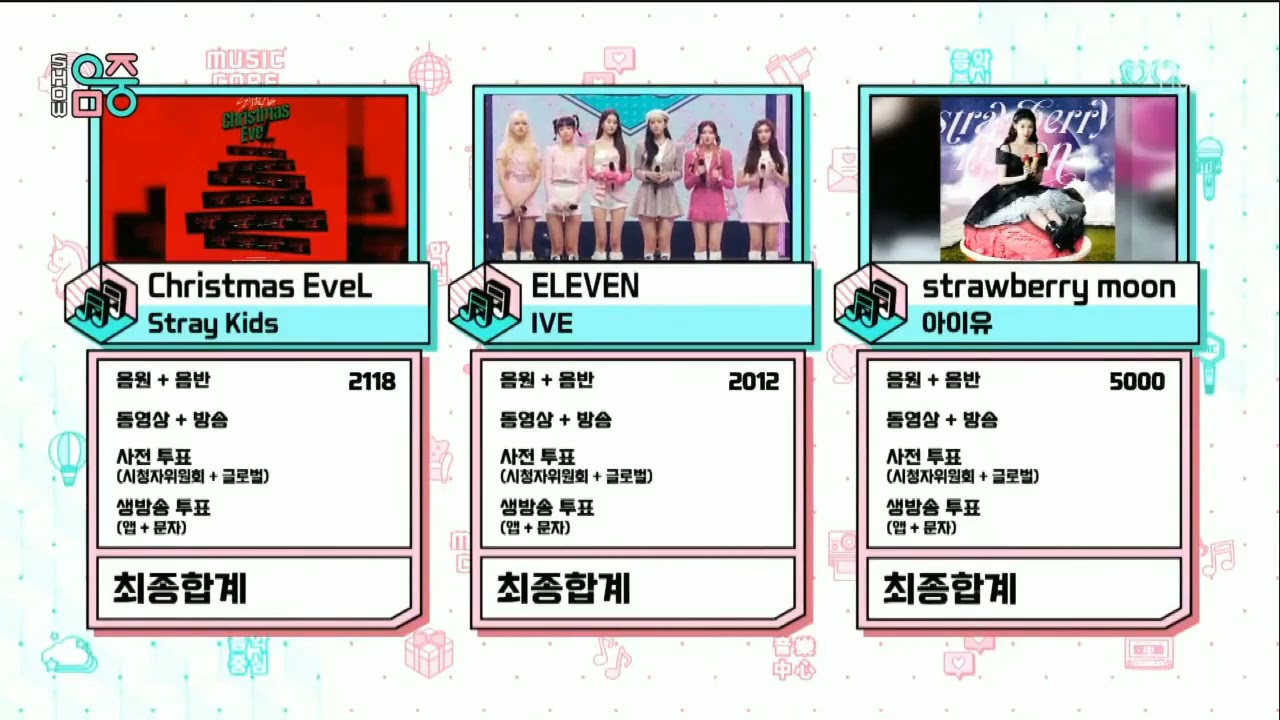 No episódio de 12 de dezembro do programa musical Inkigayo os indicados ao primeiro lugar na disputa foram: IU com ‘Strawberry Moon’, GyeongseoYeJi e Jeon Gunho com ‘If you lovingly call my name’ e IVE com ‘ELEVEN’