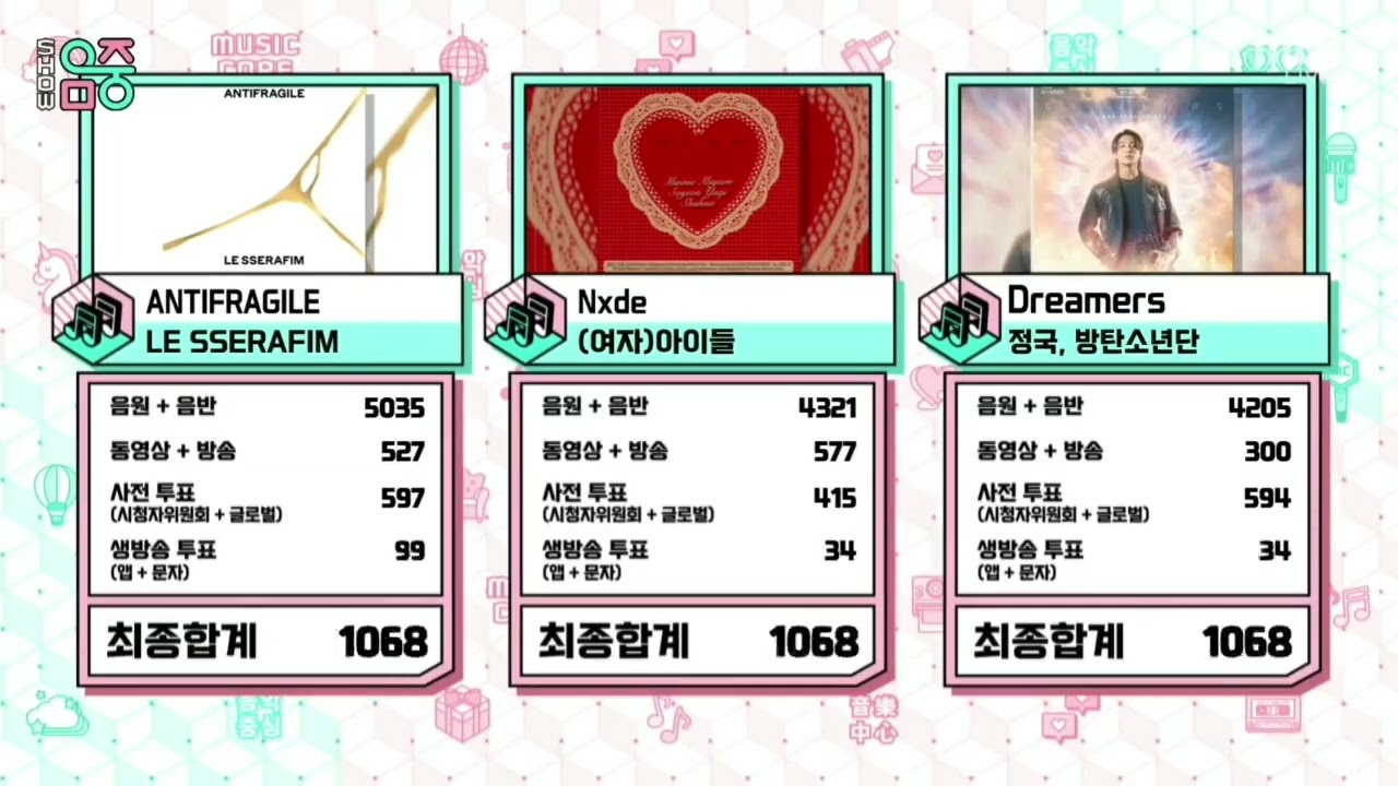 No episódio de 17 de dezembro do “ Music Core ” da MBC, os candidatos ao primeiro lugar foram “ANTIFRAGILE” do LE SSERAFIM, “Nxde” do (G)I-DLE e “ Dreamers” do Jungkook do BTS.